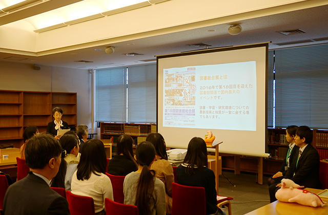 まずは、図書館事務部事務課の秋場課長から、今回の図書館キャラクター・グランプリについての説明が行われるところから授賞式は始まりました。