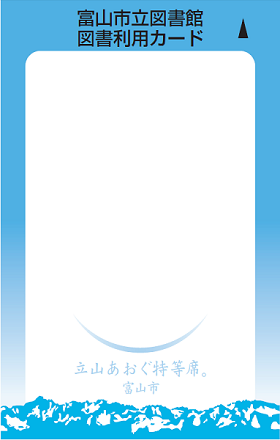 借りている資料のタイトルと返却日が印字される磁気リライトカードで、富山市のキャッチコピー「立山あおぐ特等席。」とともに立山連峰の山並みがデザインされています。