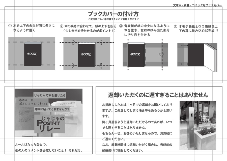 所蔵本を貸し出す際に、本が傷まないよう貸出袋に入っているブックカバーを極力使用するようにお願いしている。