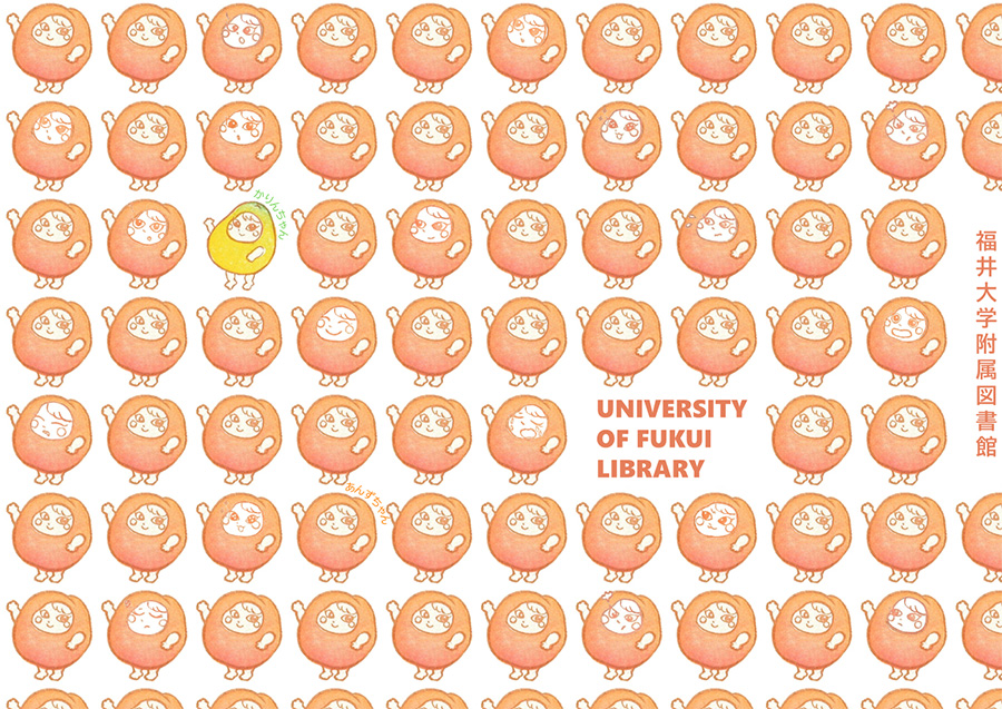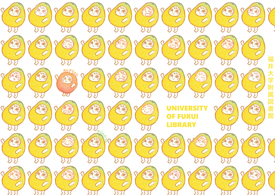 福井大学附属図書館のキャラクター「かりんちゃん」「あんずちゃん」のパターン柄です。消しゴムはんこの図柄で、喜怒哀楽あふれる豊かな表情が表現されています。