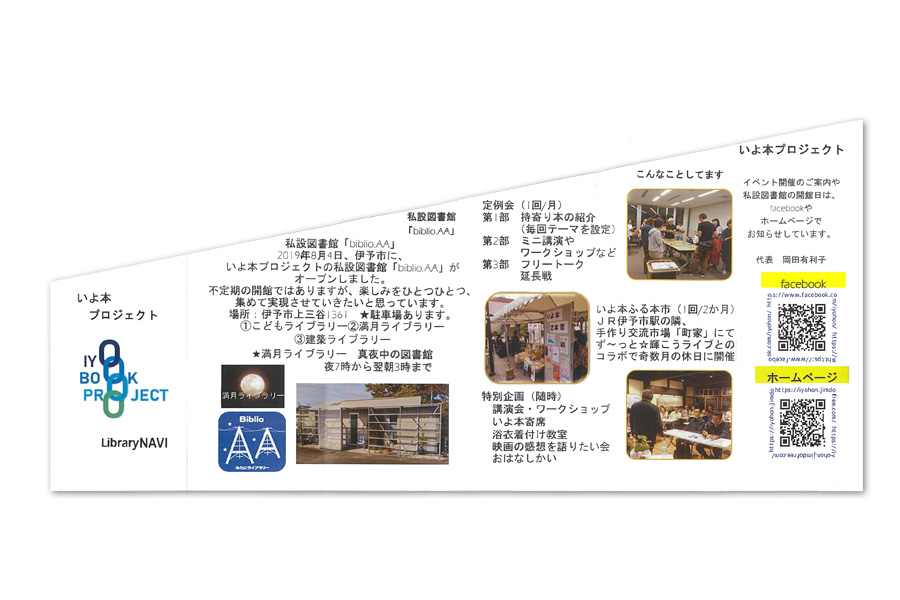 愛媛県伊予市で「いよ本プロジェクト」という本をキーワードにした活動を行っています。参加交流型のイベント・古本市の開催や、私設図書館「biblioAA」を開館しています。私たちの活動を紹介するLibraryNAVIを作りました。