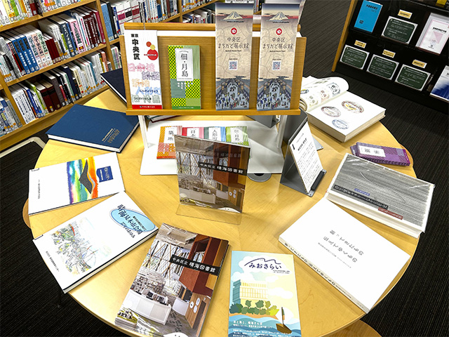 「晴海図書館と中央区」と題し、晴海図書館がある中央区の魅力を紹介する展示を実施しました。2024年に開館した晴海図書館の紹介に加え、中央区ゆかりの企業や観光スポットをまとめたパンフレットも配布しました。